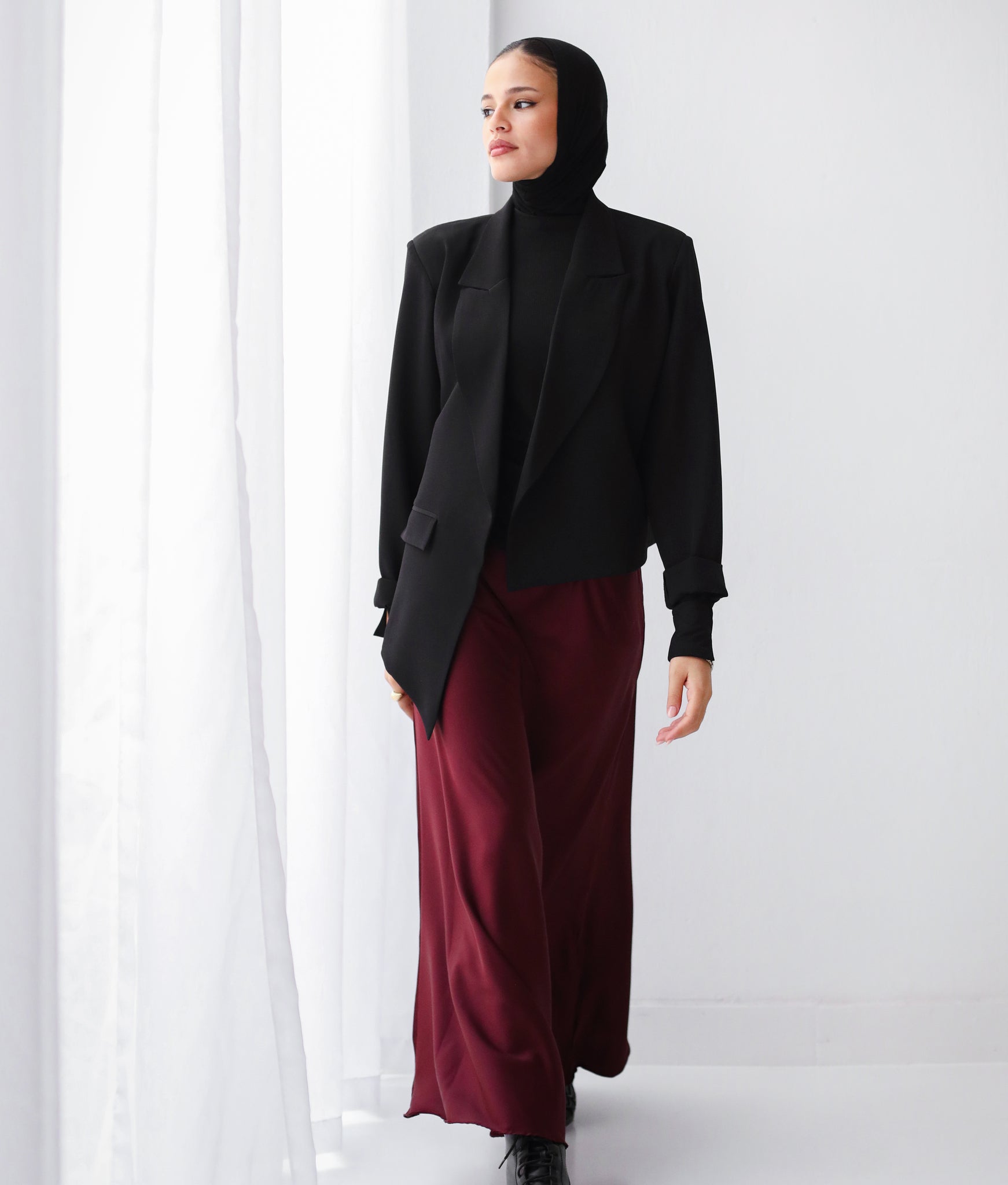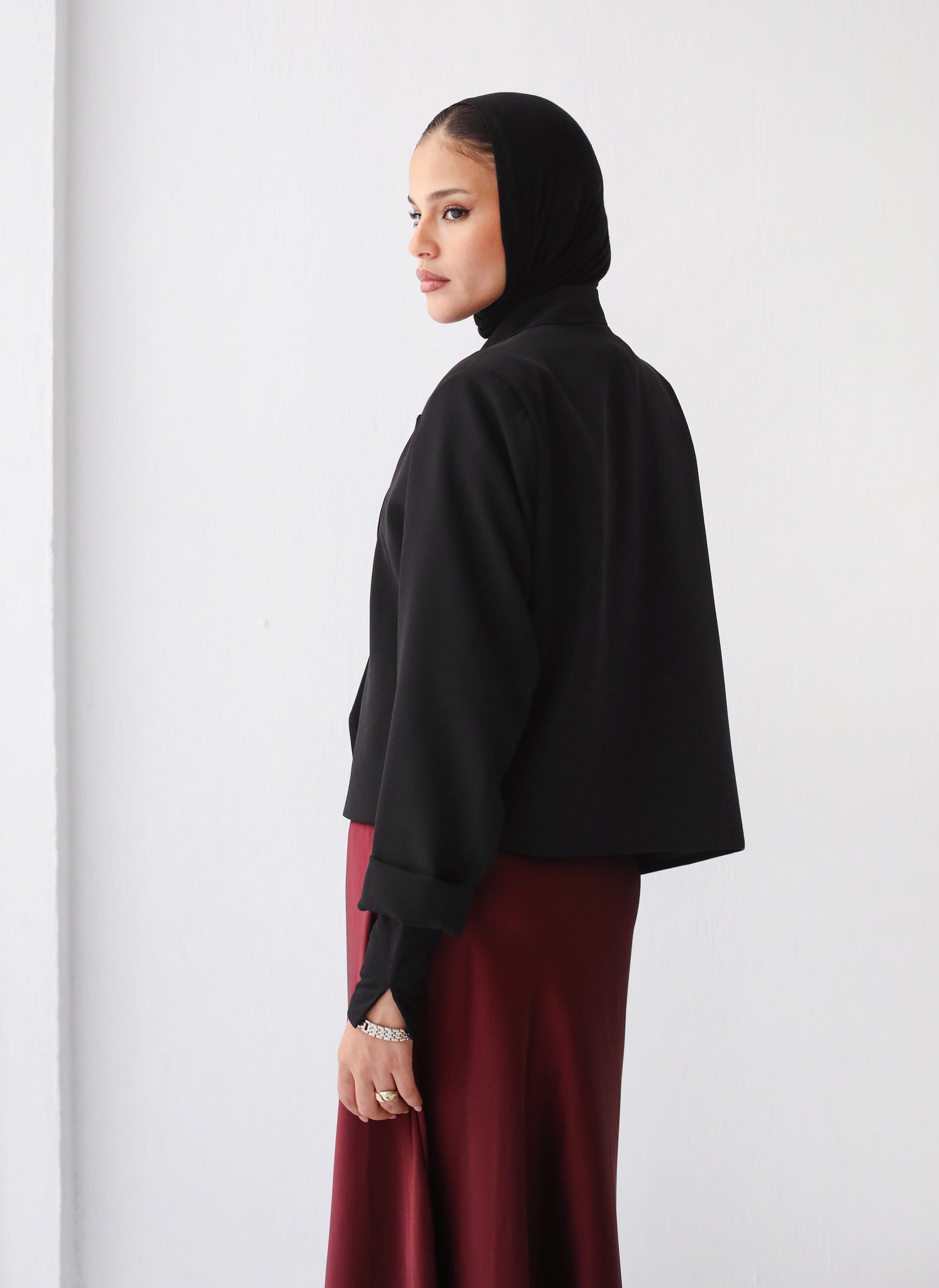 A sleek blazer with an asymmetric drape, designed to elevate your office look with effortless elegance. Perfect for both formal meetings and smart-casual styling.