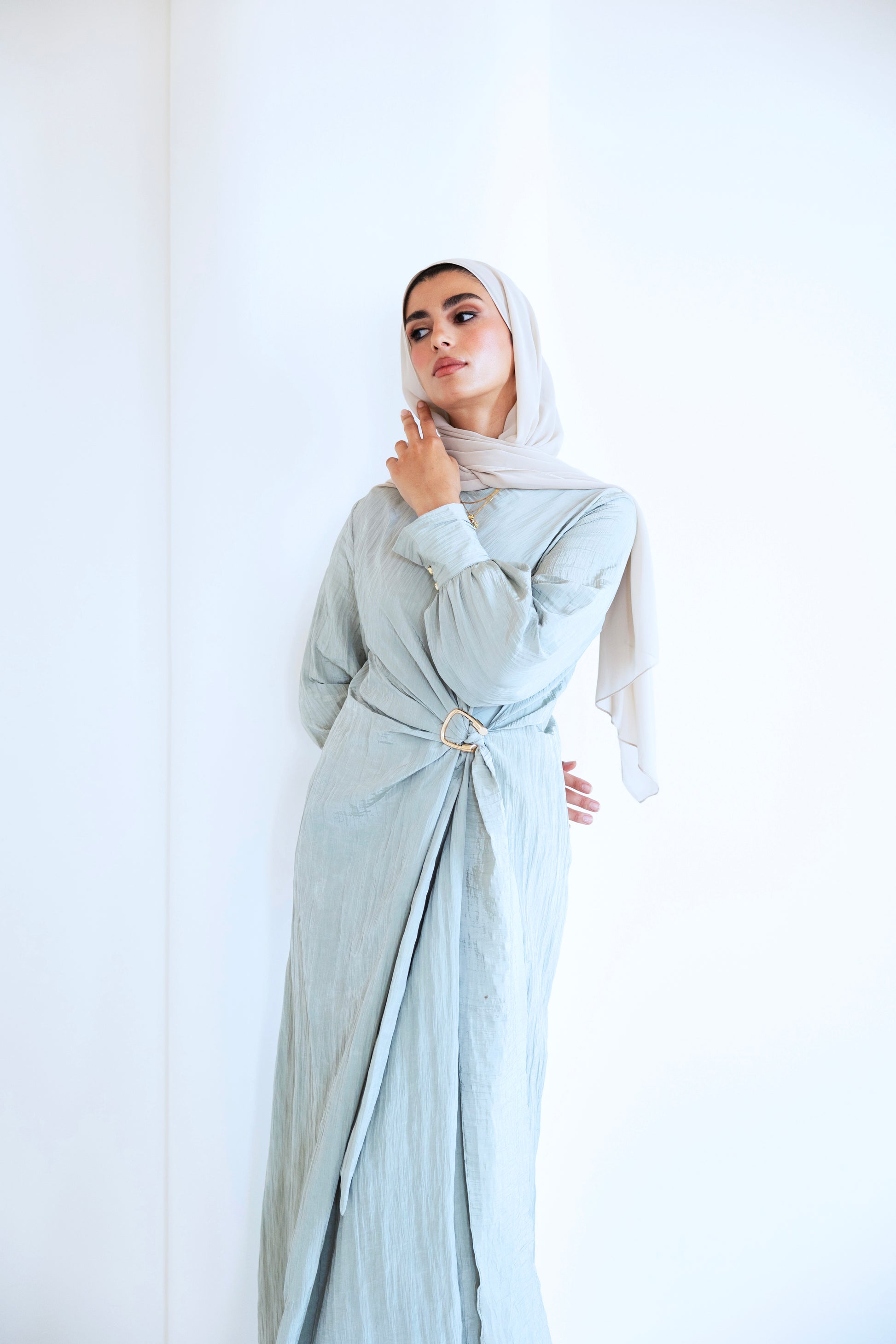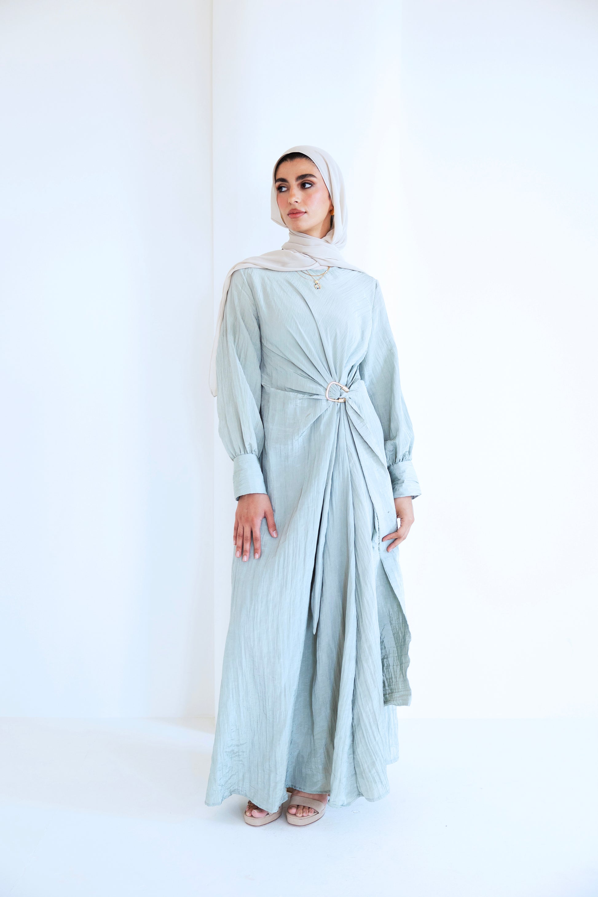 A full-length dress in airy crinkled fabric, designed with a gathered drape and side buckle detail. Available in soft blush, sage, and brown — an effortless balance of elegance and comfort.
