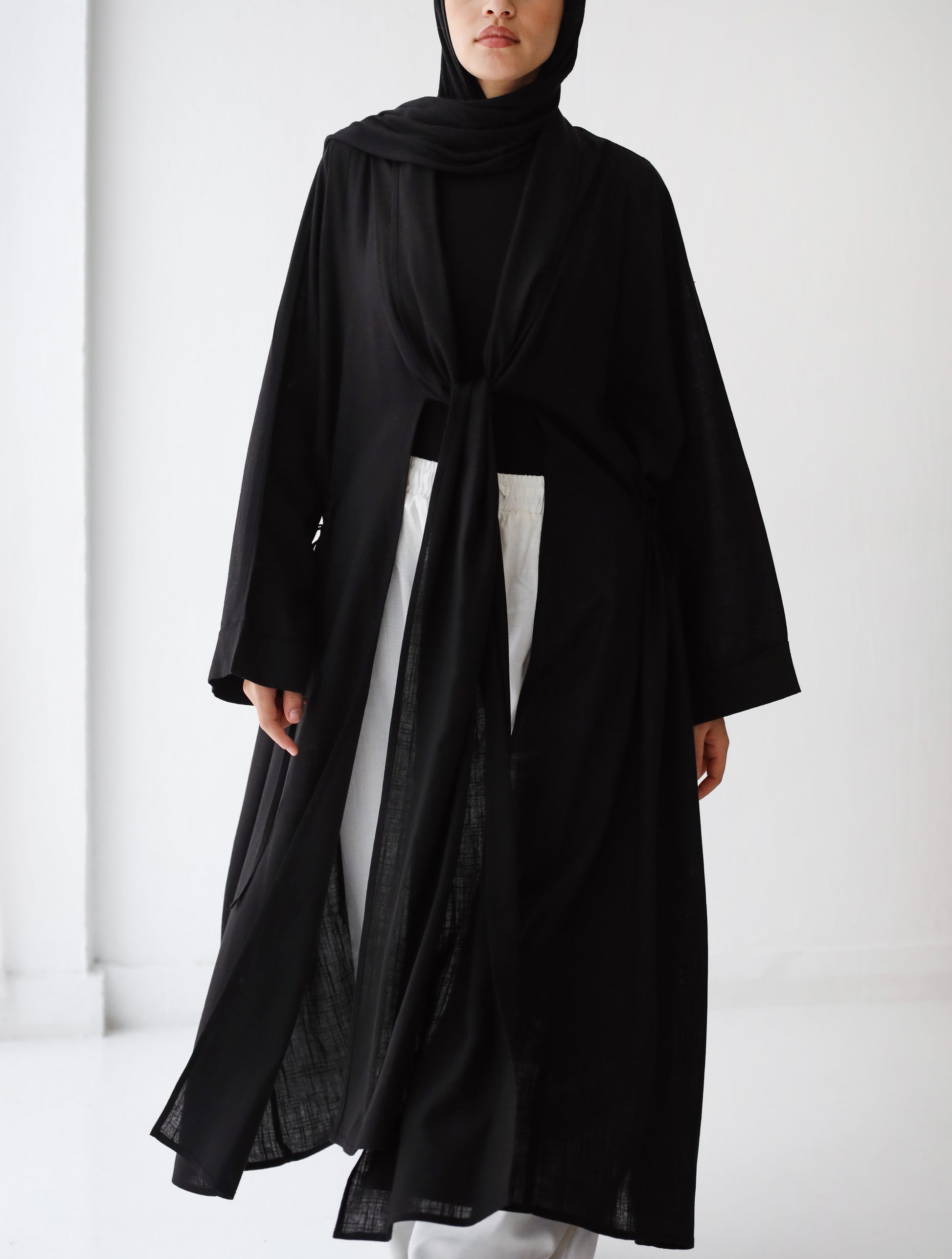 A relaxed black cardigan designed for everyday wear. Featuring a flowy tie-front closure, wide sleeves, and adjustable side ties, this lightweight layer brings comfort and ease to your casual wardrobe while keeping a modern, laid-back style .