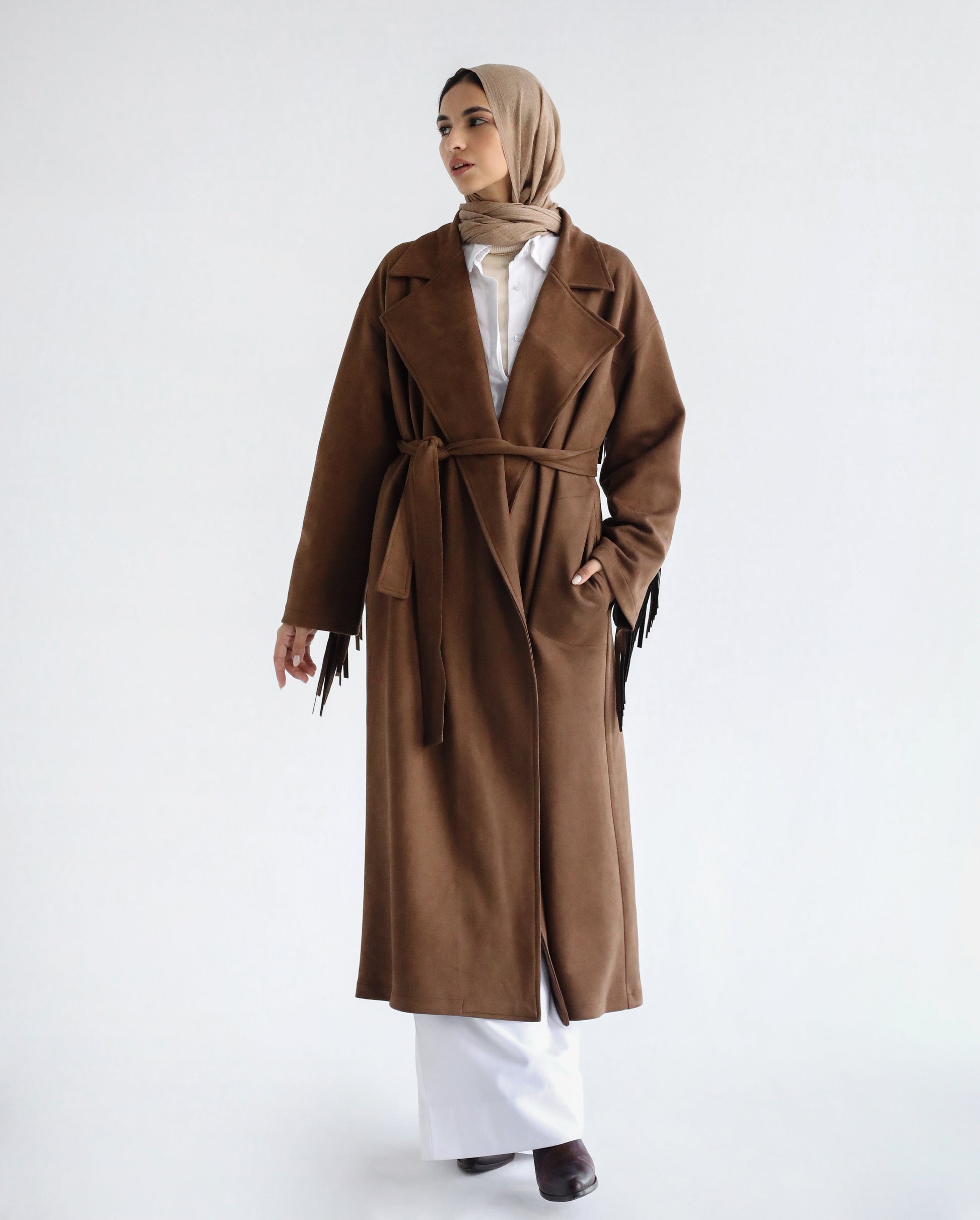The Fringe Statement Coat features soft suede-touch fabric, long flowing fringes along the sleeves, and a self-tie belt that shapes the waist elegantly.Perfect for elevating your outfits, styling through winter, and adding subtle statement detail to your daily wear