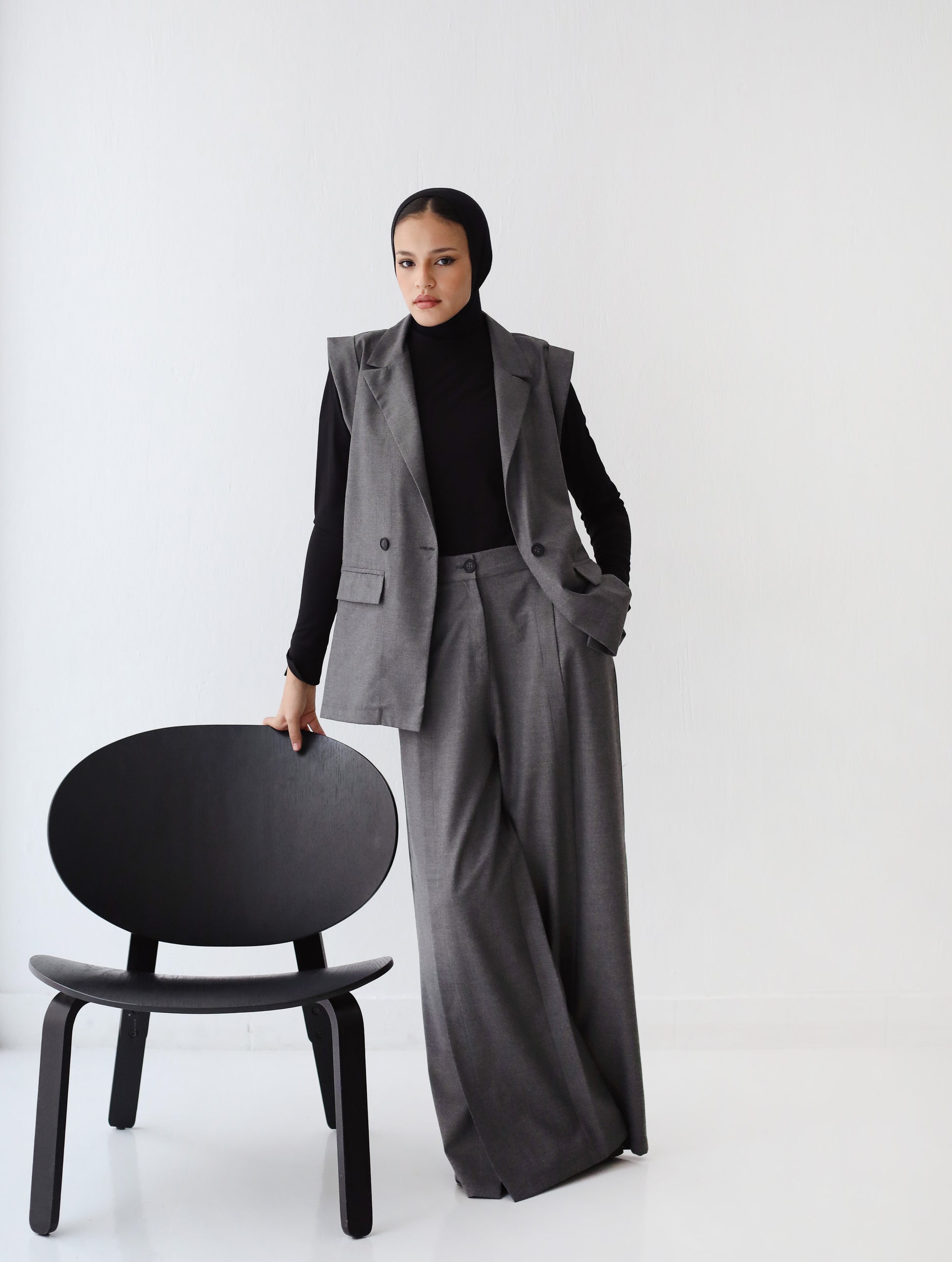 A tailored sleeveless blazer paired with wide-leg trousers, designed for a modern office look that blends authority with effortless style.
