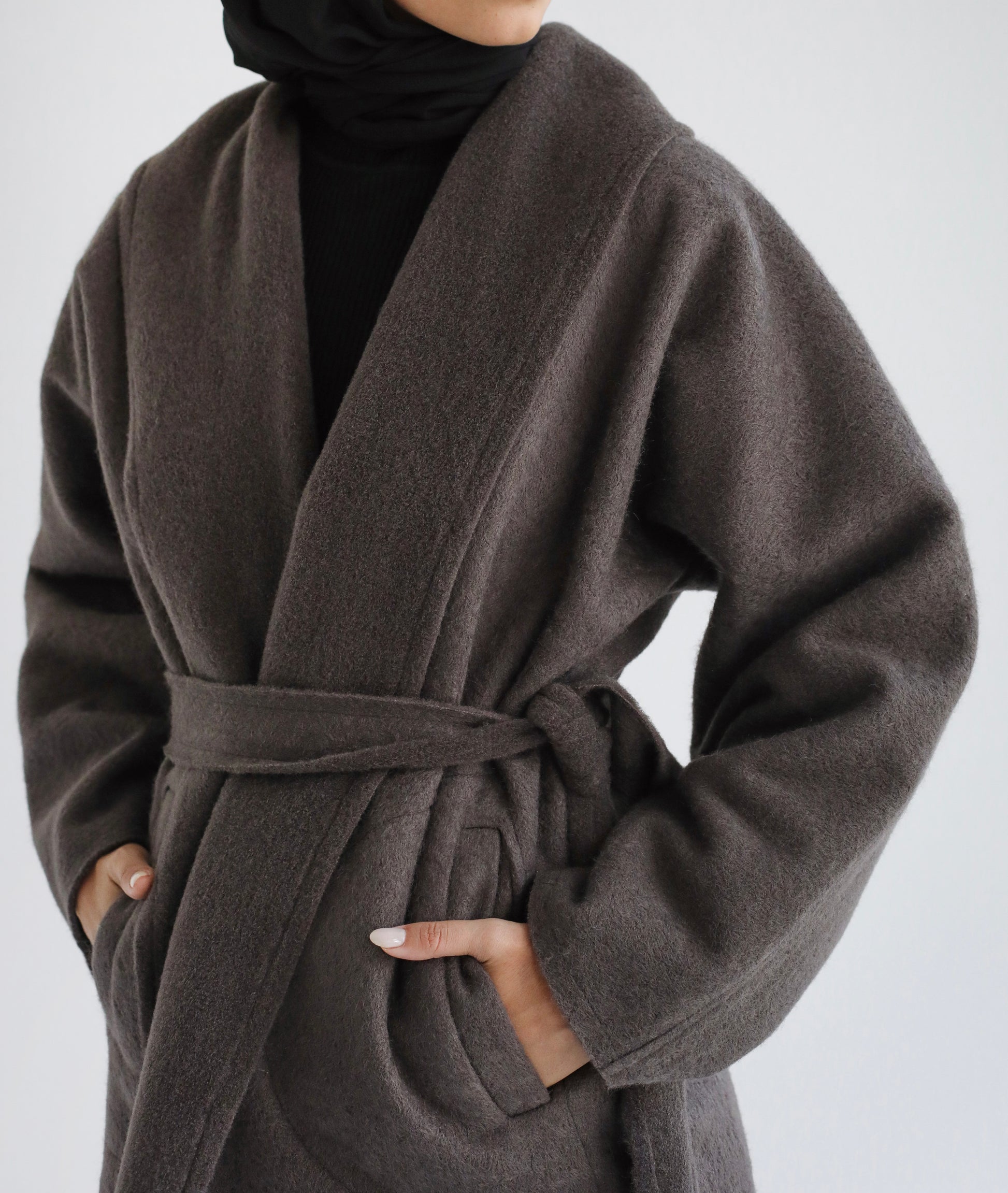 A soft, warm wrap jacket designed in our signature minimal silhouette.Crafted from plush textured wool, this piece features a relaxed kimono cut, wide shawl neckline, and a self-tie belt that shapes the waist while keeping the look effortless. Finished with clean patch pockets for function and ease.